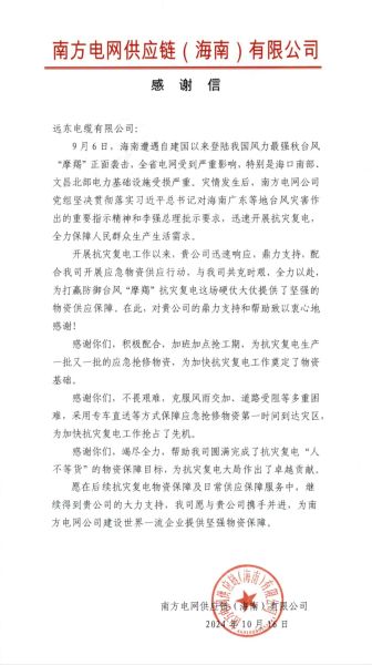 近日,南方電網(wǎng)供應(yīng)鏈(海南)有限公司發(fā)來感謝信,對(duì)遠(yuǎn)東電纜在關(guān)鍵時(shí)刻伸出援手表示衷心感謝,并期待在未來能夠與遠(yuǎn)東電纜深化合作,共同為國(guó)民基礎(chǔ)供應(yīng)服務(wù)提供更加堅(jiān)強(qiáng)有力的物資保障。